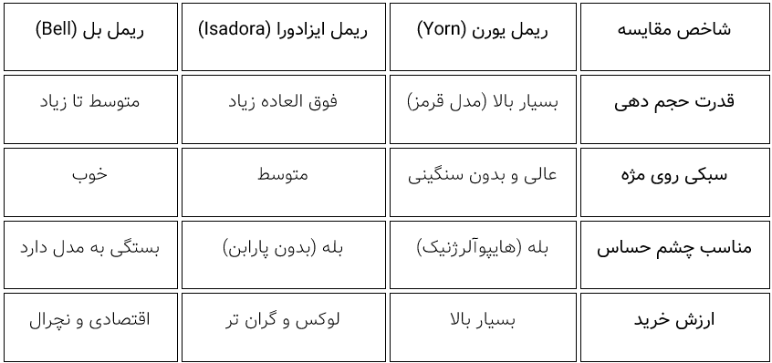 فراموش نکنید که خرید ریمل یورن از یک فروشگاه مطمئن ، یعنی خداحافظی با ریزش مژه و سیاهی دور چشم. آیا می خواهید بدانید کدام یک از این مدل ها با ریمل فعلی شما تفاوت بیشتری دارد؟