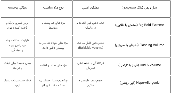 برس های الیافی بزرگ و پَرپُشت : این برسها (مانند آنچه در سری Big Bold دیده میشود) برای جذب حداکثر مواد ریمل و انتقال آن به مژهها طراحی شدهاند و تمرکز اصلی آنها بر حجمدهی فوقالعاده است.